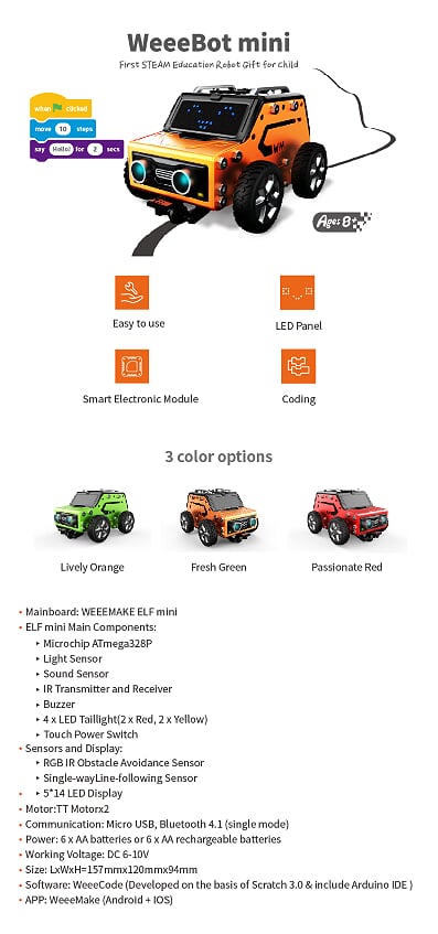 Het is een educatieve versie die is geüpgraded op basis van de STEAM-robot WeeeBot mini op instapniveau. De producten zijn voornamelijk gericht op het leren programmeren, via diverse oefeningen. Het combineert de kennis in wetenschap, technologie, engineering, kunst, wiskunde en wordt ondersteund door acht (8) ideeënkaarten en zestien (16) lessen. Het is van toepassing op het instapniveau van STEAM en zal zijn gebruikers begeleiden bij het leren programmeren en multidisciplinaire kennis, om creatief ontwerp te maken, evenals bij het trainen van programmamindsets.